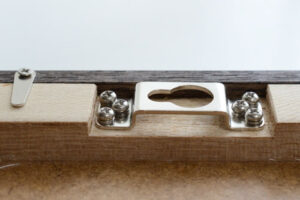 上の写真の様に、裏板の枠材に 4mm の深さで掘り込みを入れ、そこに取り付け金具を設置しました。取り付け金具としては、フクイのハンガーセットAを用いています。また、この仕掛けを、小型サイズ以外の全商品に取り付けています。